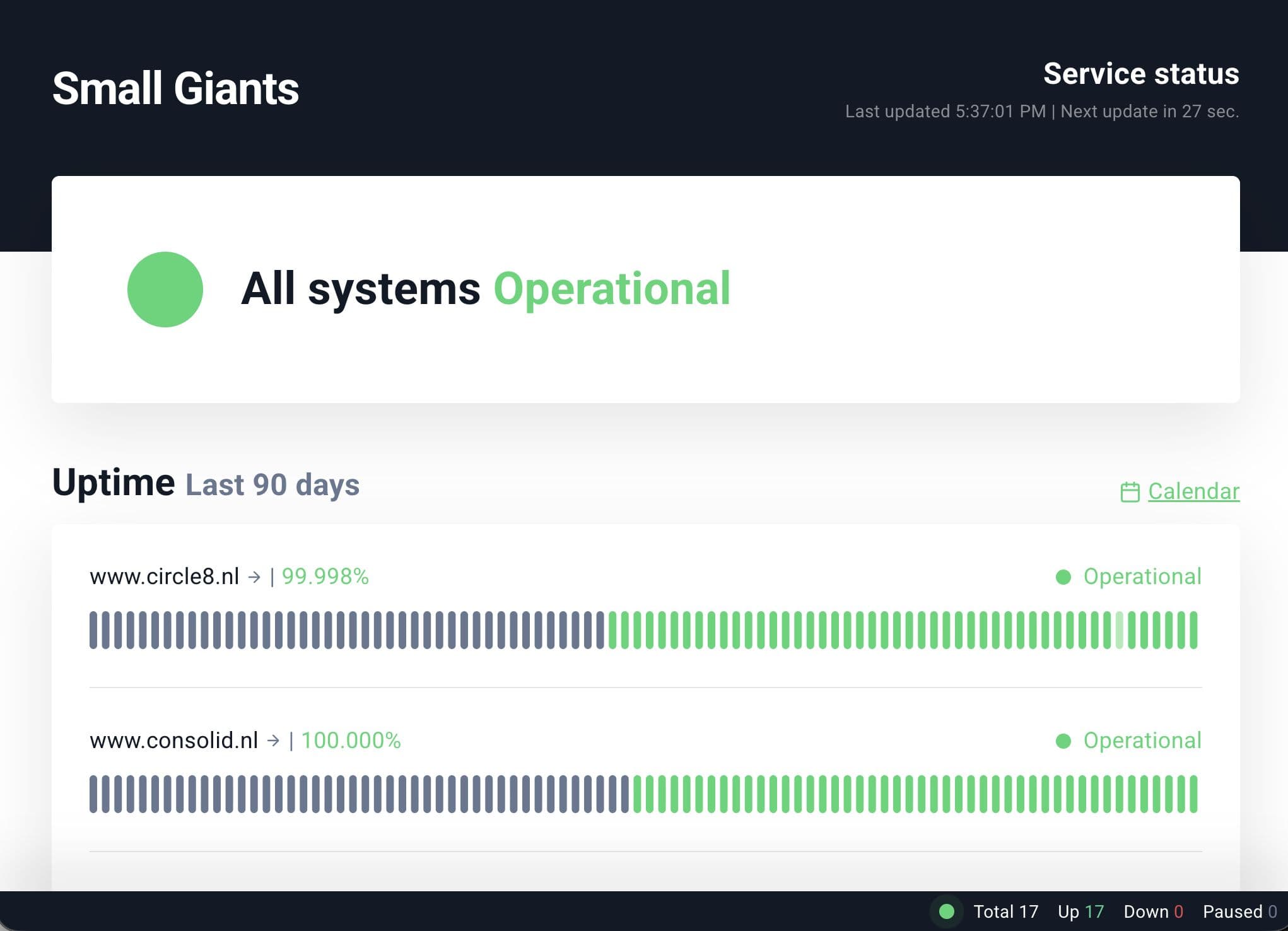 One month of monitoring across our development clients. two minutes of downtime. every second logged and reportable.